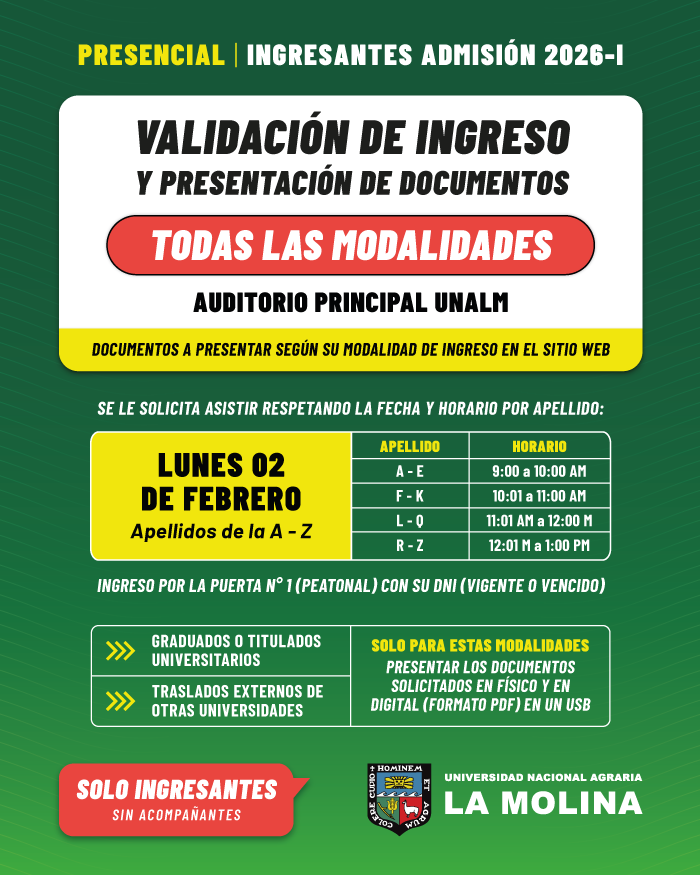 Av. La Molina s/n La Molina | Tel: (01)6147800 anexo 137 | Cel: 937413951 - 978585632 | Correo: admision@lamolina.edu.pe